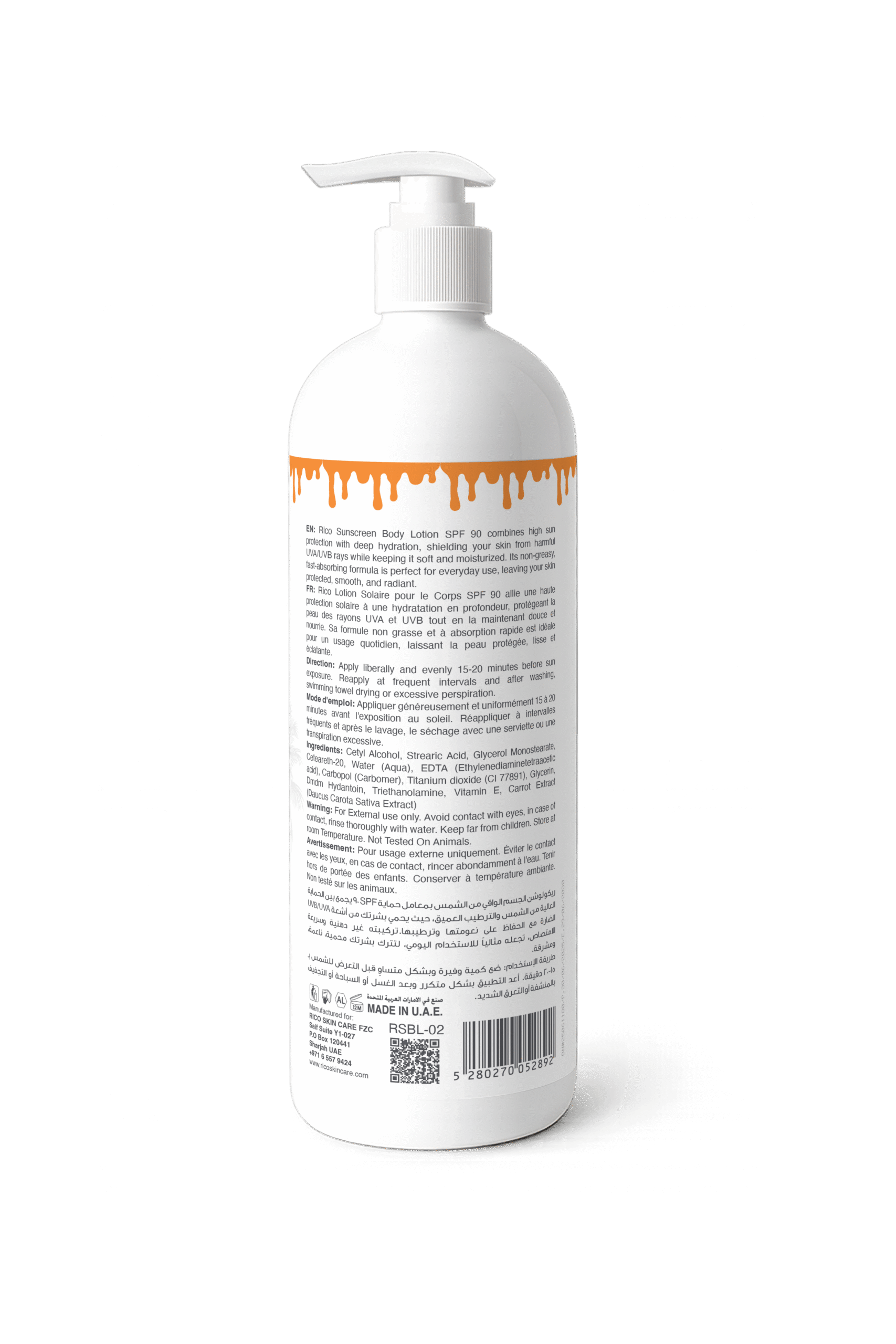 Rico Sunblock Body Lotion SPF 90 (250ml) offers maximum sun protection, specially developed for strong sun exposure and sensitive skin. Its high-performance formula protects your skin from deep sun damage while keeping it hydrated, smooth, and safe throughout the day. Perfect for outdoor activities, beach trips, or long hours in the sun, this lotion applies evenly, absorbs quickly, and leaves no sticky feel. A must-have for those who demand strong and reliable sun protection with skincare benefits.